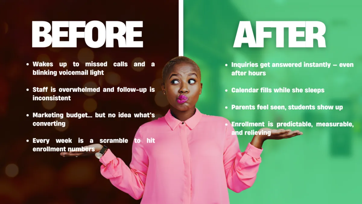 Meanwhile, the pressure to “get numbers up” keeps growing. And the worst part? Your leads are leaking — and it’s costing you tuition every day.follow-up